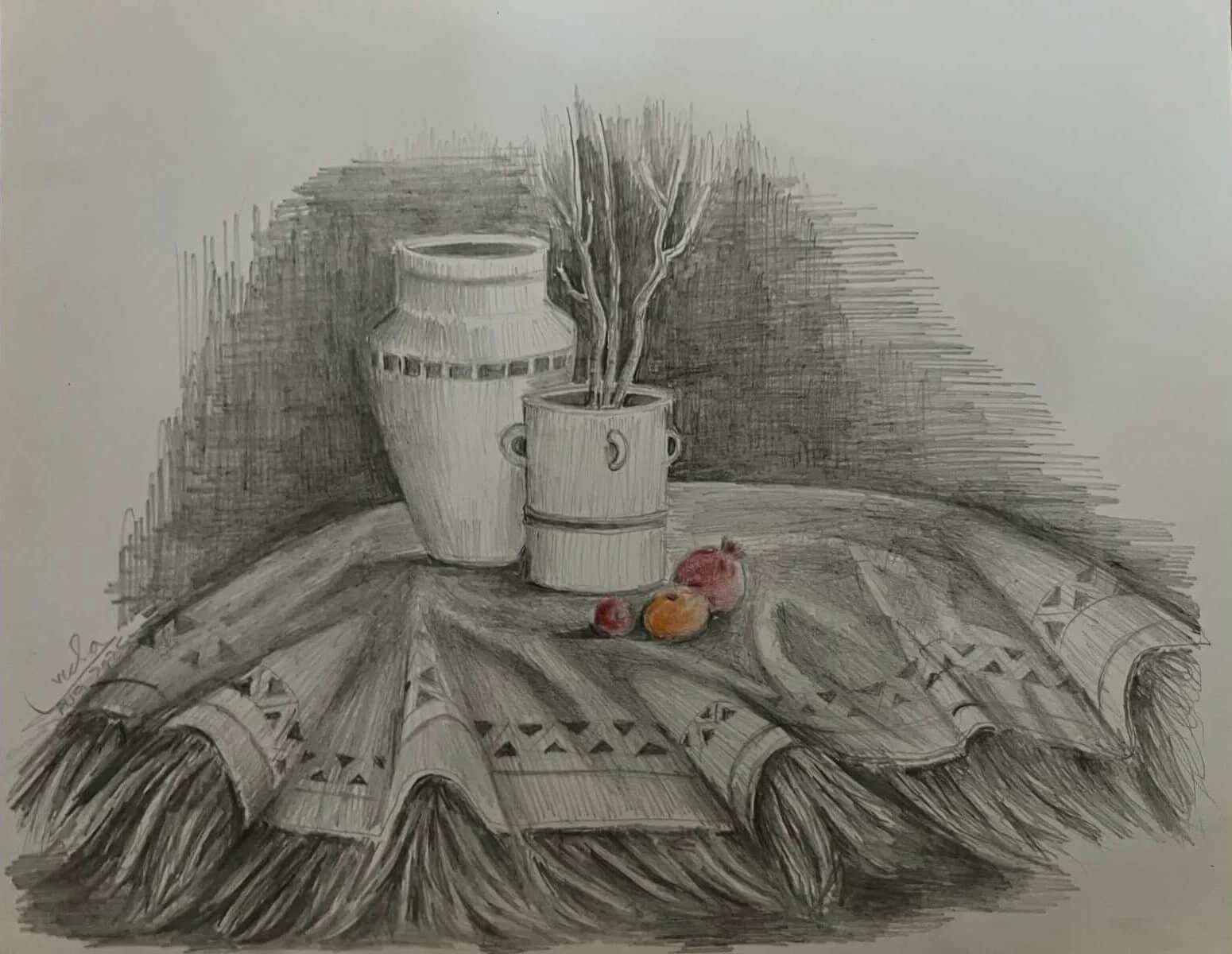 Drawn gently in pencil, this piece captures a moment that no longer exists — yet lives on in memory. Two humble vases rest quietly on a patterned rug, beside a pomegranate and an apple — symbols of simplicity, tradition, and the sweetness of forgotten days. No words were needed — the silence spoke everything.